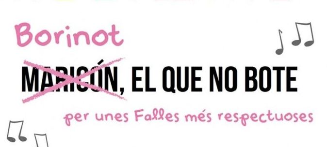 Desde el colectivo, piden que se cante ‘Borinot el que no bote‘ en lugar del arraigado cántico ‘maricón el que no bote’, ya que mantener en el imaginario colectivo la palabra ‘maricón’ como un insulto solo refuerza la LGTBIfobia en la sociedad. Siguiendo con la tradición del ‘maricón el que no bote’ en las fiestas de las Fallas se perpetúa el acoso y las agresiones a las personas lesbianas, gais, trans y bisexuales.